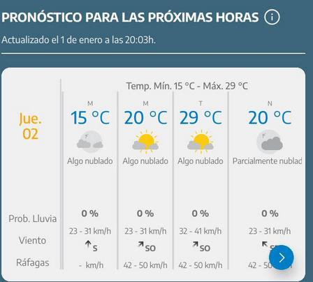 La máxima de las horas próximas podría anotar unos veintinueve grados centígrados contando con vientos de hasta 50 kilómetros por hora.