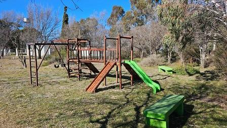 Se colocaron nuevos juegos de madera en la Plaza Pedro Minich de Colonia San Martín de Tours.