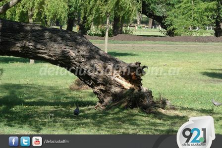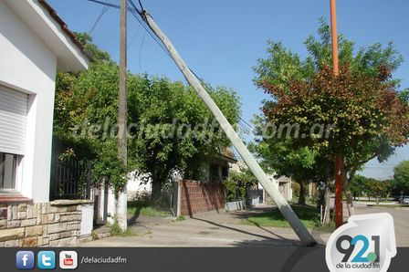 Frente al local comercial de la firma Combes Implementos Agrícolas, sobre Avenida Pueyrredón 455, un poste del servicio de telefonía sufrió el paso de la tormenta.