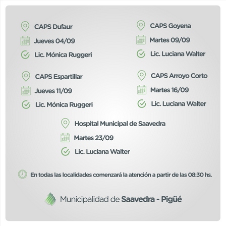 La Lic. Luciana Walter estará en el Hospital Municipal de la localidad, hoy, martes, 23 de septiembre, atendiendo embarazadas, recibiendo consultas por anticoncepción, y por controles ginecológicos