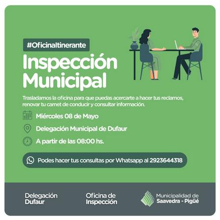 Quienes lo deseen pueden acercar sus inquietudes a la Delegación Municipal, realizar el trámite del carnet de conducir en el lugar, o contactarse vía Whatsapp al 2923 64 43 18 para que los inspectores puedan dar respuesta a estas consultas.