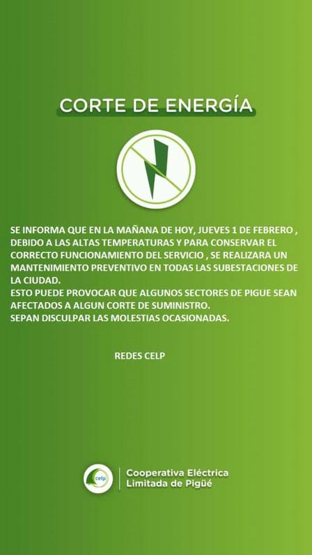 La Cooperativa Eléctrica de Pigüé publicó donde "se informa que en la mañana de hoy, jueves 1 de febrero, debido a las altas temperaturas, y para conservar el correcto funcionamiento del servicio, se realizará un mantenimiento preventivo en todas las sub estaciones de la ciudad.