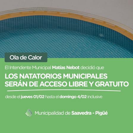 Desde el jueves 1 de febrero hasta el domingo 4 de febrero de 2024 la Jefatura Comunal Distrital dispuso que el ingreso sea sin cargo en los natatorios del Partido de Saavedra.