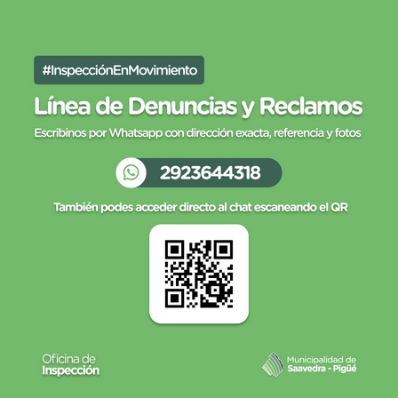 La Oficina de Inspección Municipal, a través de un código QR, y por Whatsapp al 2923 64 43 18, recibe los datos requiriendo la dirección exacta, la referencia del hecho, y fotografías que constaten el reclamo.