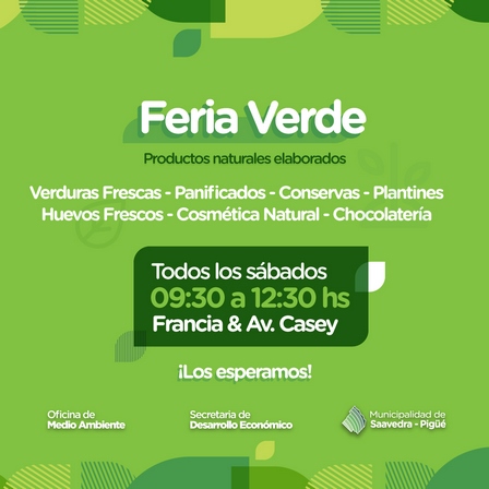 A partir de 9.30 horas, hasta las 12.30, la Feria Verde tendrá lugar en calle Francia esquina Avenida Eduardo Casey de Pigüé