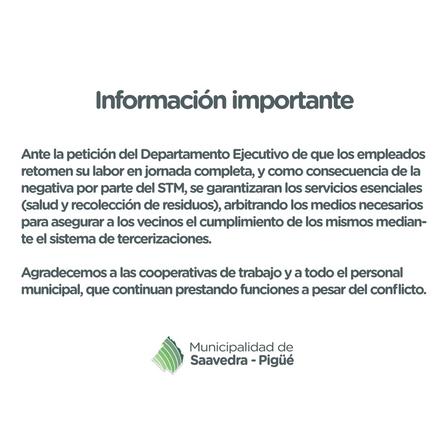 El parte de prensa dice "ante la petición del Departamento Ejecutivo de que los empleados retomen su labor en jornada completa, y como consecuencia de la negativa por parte del STM, se garantizarán los servicios esenciales (salud y recolección de residuos), arbitrando los medios necesarios para asegurar a los vecinos el cumplimiento de los mismos mediante el sistema de tercerizaciones.