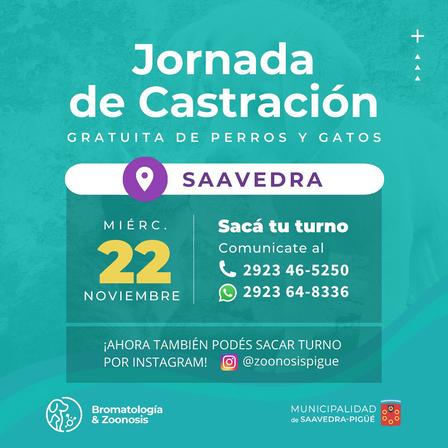 Para el día de mañana, miércoles, por la mañana, en Saavedra, habrá castraciones de perros y gatos.