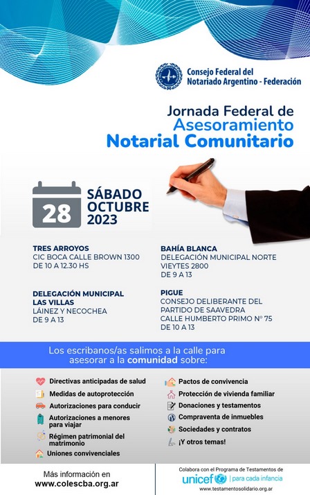 El sábado próximo, 28 de octubre, se llevará a cabo una jornada de asesoramiento notarial, gratuito, desde las 9.00 hasta las 13.00 horas, orientada a la comunidad en general.