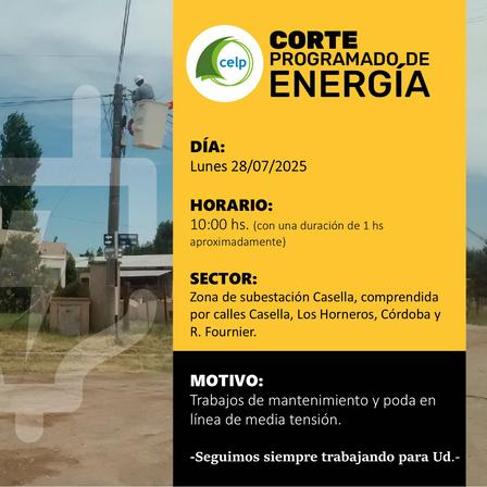 La Cooperativa Eléctrica de Pigüé confirmó que producirá una interrupción en el suministro de energía en el área de la Sub Estación Casella comprendida por las calles Casella, Los Horneros, Córdoba y Rastreador Fournier.