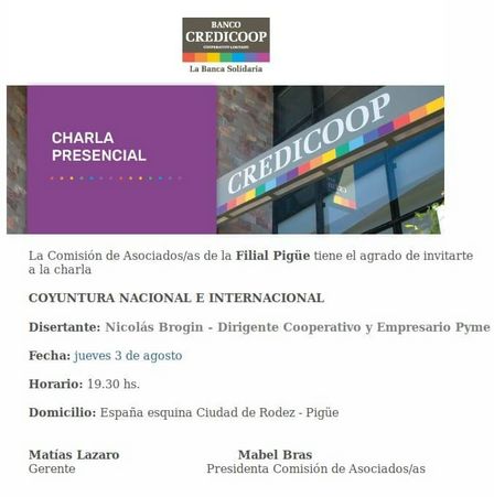 Este jueves, a las 19.30 horas, Nicolás Brogin, dirigente cooperativo y empresario PYME, estará disertando ante quienes deseen acudir al salón de los altos de calle Ciudad de Rodez esquina España de Pigüé.