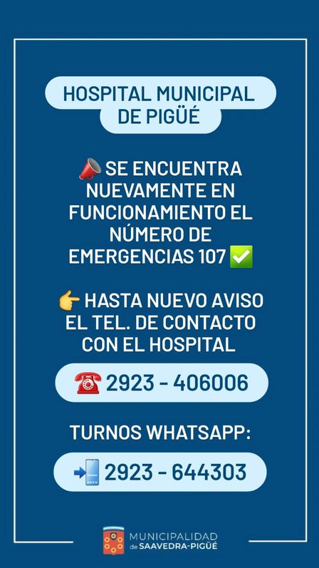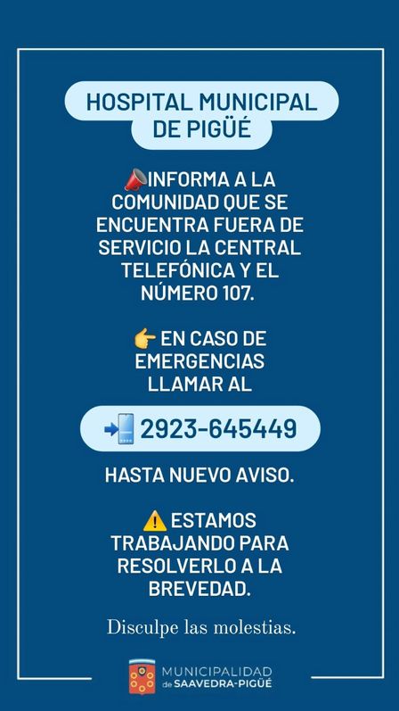 El Hospital Municipal de Pigüé tiene inconvenientes con el fijo 107, ya que, está inhabilitado temporariamente.