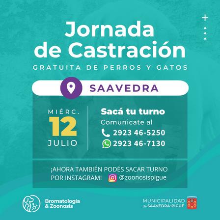 Hoy, miércoles 12 de julio, por la mañana, habrá castraciones de mascotas en la localidad de Saavedra.