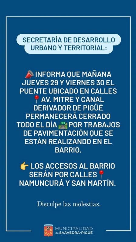 En Pigüé, por los trabajos de pavimentación que se llevan a cabo en el Barrio EDES, permanecerá interrumpido el tránsito en el puente ubicado sobre el Canal Derivador a la altura de Avenida Mitre