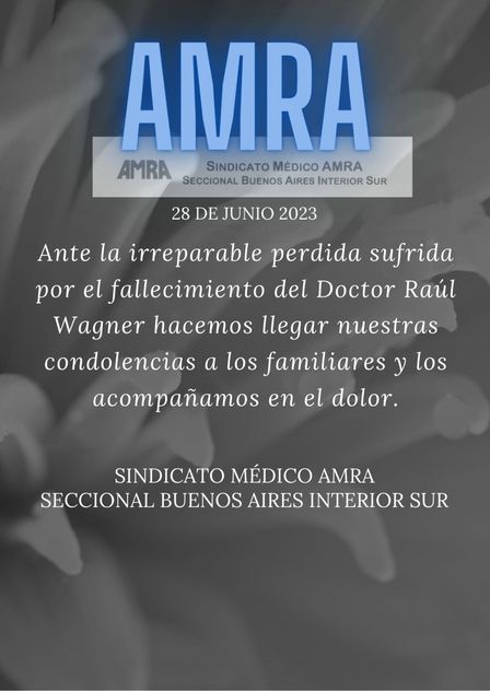 El mensaje dice "ante la irreparable pérdida sufrida por el fallecimiento del Doctor Raúl Wagner hacemos llegar nuestras condolencias a los familiares y los acompañamos en el dolor".