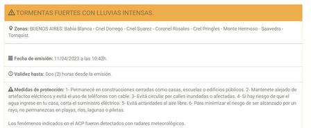 De acuerdo al Servicio Meteorológico Nacional las mismas estarán acompañadas de intensas ráfagas, ocasional caída de granizo, fuerte actividad eléctrica y abundante caída de agua en cortos períodos.