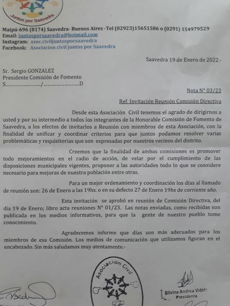 Con motivo de tratar cuestiones referidas a la localidad de Saavedra la Asociación Civil Juntos elevó una nota a la Sociedad de Fomento.