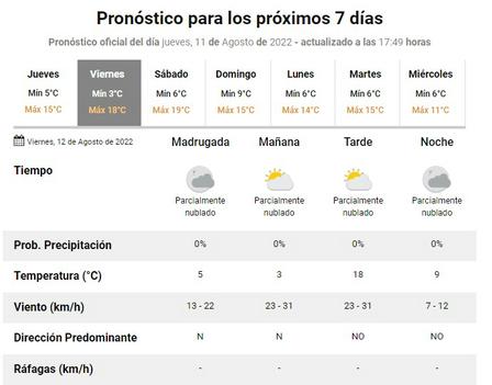 En la localidad el registro más elevado de la temperatura, de acuerdo a las estimaciones del Servicio Meteorológico Nacional, podría llegar a los quince grados.