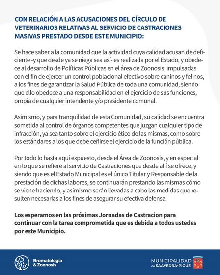 Por las expresiones del Círculo de Veterinarios relativas al servicio de Castraciones Masivas el Municipio hizo públicas sus declaraciones.