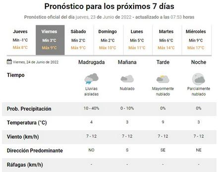 El Servicio Meteorológico Nacional, para hoy, viernes, está previendo una máxima de nueve grados centígrados en la ciudad.