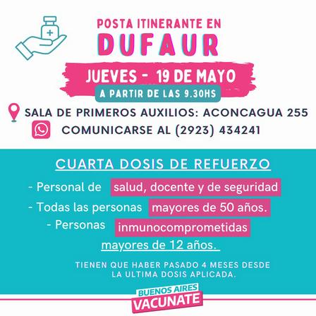 En la Sala de Primeros Auxilios, ubicada en calle Aconcagua 255 de Dufaur, estará la Posta de Vacunación Itinerante.