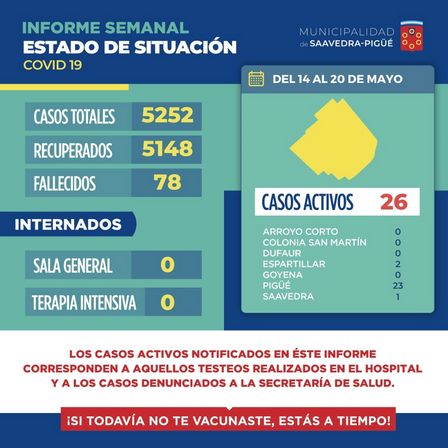 El número de pacientes activos cuenta 26 en total siendo 23 los registrados en Pigüé, 2 en Espartillar, y 1 en Saavedra.