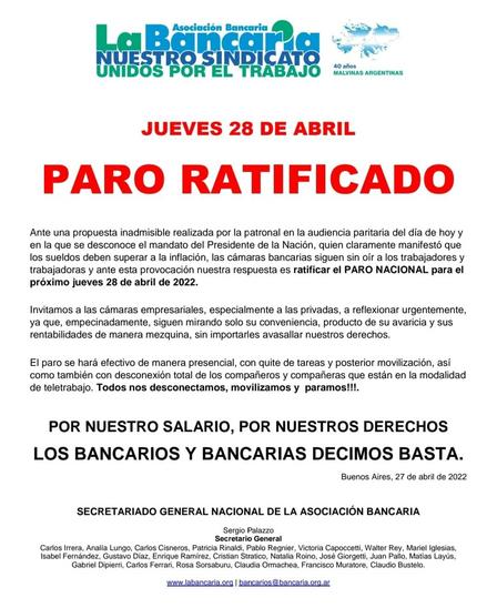 El comunicado del gremio La Bancaria expresa “por nuestros salarios, por nuestros derechos. Ante una propuesta inadmisible realizada por la patronal en la audiencia paritaria del día de hoy y en la que se desconoce el mandato del Presidente de la Nación, quien claramente manifestó que los sueldos deben superar a la inflación, las cámaras bancarias siguen sin oír a los trabajadores y trabajadoras y ante esta provocación nuestra respuesta es ratificar el paro nacional para el próximo jueves 28 de abril de 2022.