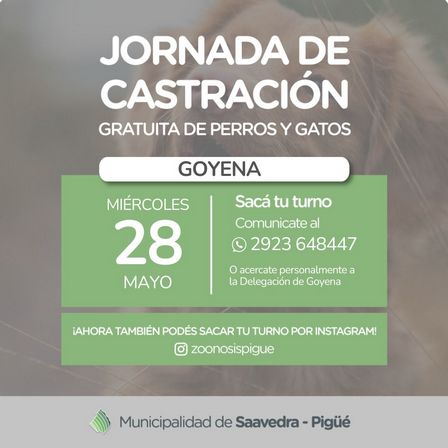 En la Delegación Municipal de Goyena, el miércoles 28 de mayo, habrá castración gratuita de mascotas.