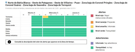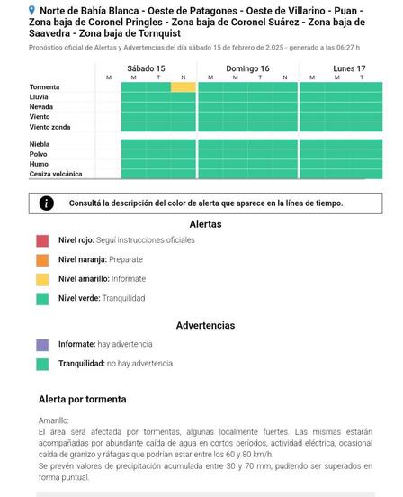El mensaje oficial de la Municipalidad de Saavedra - Pigüé indica "queremos informarle a toda la comunidad la zona del Distrito de Saavedra continua en alerta y que durante la noche de hoy lunes, 3 de noviembre de 2025, y mañana martes 4 de noviembre de 2025, se verá afectada por precipitaciones y vientos moderados.