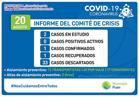 En el informe diario del Municipio sostienen que hay dos casos en estudio que están internados en Hospital de Puan.