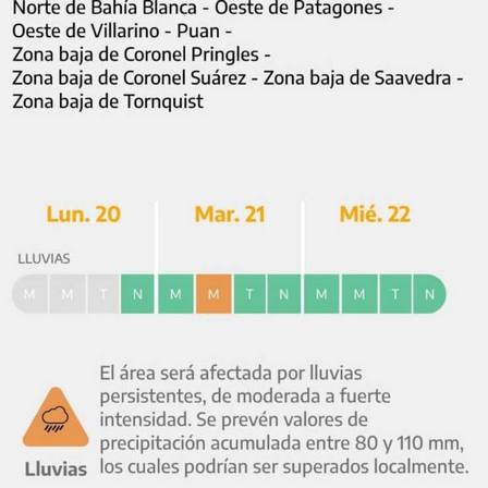 En la zona Norte de Bahía Blanca, el Oeste de Patagones, el Oeste de Villarino, Puan, la Zona Baja de Coronel Pringles, la Zona Baja de Coronel Suárez, la Zona Baja de Saavedra, y la Zona Baja de Tornquist, rige esta advertencia.