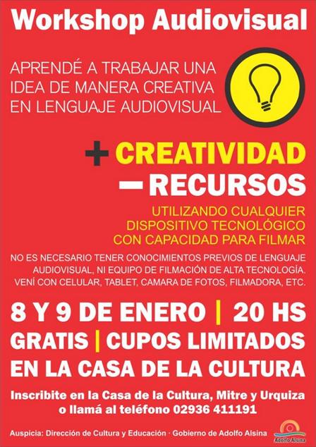 La Dirección de Cultura y Educación de Adolfo Alsina, abrió la inscripción para el Taller Audiovisual, dictado por Francisco Cauterucci, los días miércoles 8 y jueves 9 de enero de 2014, a partir de las 20.00 horas.