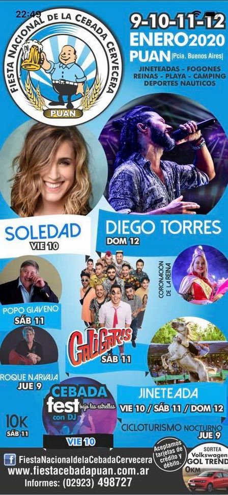 Los días 9, 10, 11, y 12 de enero tendrá lugar la presentación de una nueva edición de la Fiesta Nacional de la Cebada Cervecera en el predio ubicado a la vera de la Laguna de Puan.