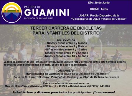 Según le indicaron a FM de la Ciudad, la Municipalidad de Guaminí, a través de la Dirección de Deportes, realizará este evento el sábado 29 de junio, a partir de las 14.00 horas, desde el Predio Deportivo de la Cooperativa de Agua Potable de Casbas.