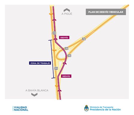 Se realiza la repavimentación de la calzada de un tramo de 420 metros, ubicado a la altura de Tornquist, al norte de Bahía Blanca. A raíz de las tareas, se procederá al corte parcial de la circulación y se habilitará un desvío provisorio sobre el km 72 de la RN 33 y su intersección con la RP 76. El desvío comenzará a funcionar hoy, a partir de las 18 horas, y tendrá una duración aproximada de tres semanas.