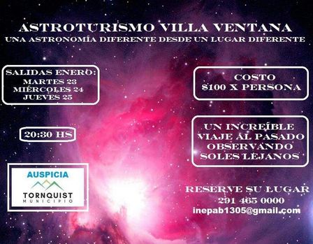 La Secretaria de Turismo está convocando a la comunidad de la zona a participar del proyecto de Astroturismo que llega a Villa Ventana los días 23,24 y 25 de enero.