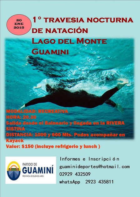 El sábado 20 de enero, con modalidad recreativa, tendrá lugar la primera travesía nocturna a nado en el Lago del Monte.