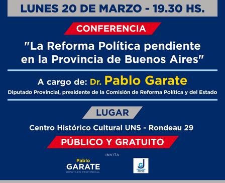 Pablo Garate estará disertando sobre la Reforma Política en el Centro Histórico Cultural de la Universidad Nacional del Sur.