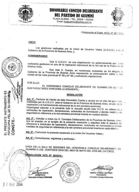 La Unión de Usuarios Viales contó con la declaración de interés municipal declarada por el Honorable Concejo Deliberante del Distrito de Guaminí.