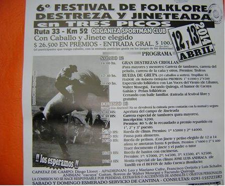 El 6º Festival de Destreza,Jineteada y Folklore organizado por el Sportman Club de Tres Picos, se realizará, tanto el sábado, como el domingo, en instalaciones de la institución.