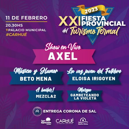 El sábado 11 de febrero, desde las 20.30 horas, el show en vivo de Axel será la principal carta de presentación del evento gratuito, contando con el humor de Beto Menta, la voz del folclore de Eloisa Irigoyen y la puesta en escena de A bailar!.