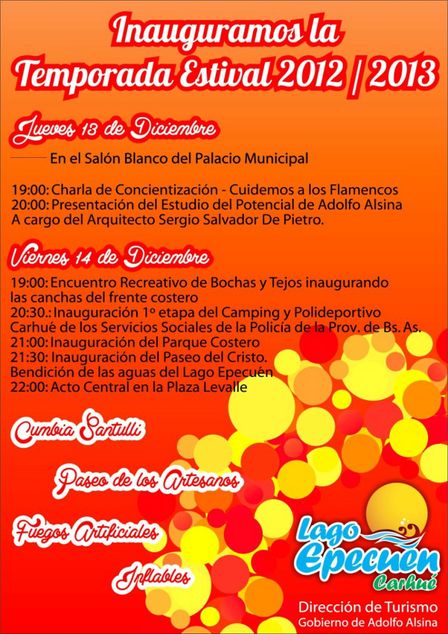 Este jueves, desde las 19.00 horas, habrá una serie de actividades en el Distrito de Adolfo Alsina - Carhué, que darán inicio a la temporada turística 2012 / 2013.