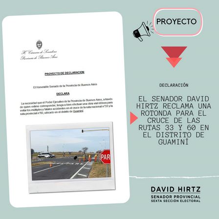 El parte de prensa del legislador asevera que "ante la innumerable cantidad de accidentes que se vienen suscitando en el cruce, de las rutas nacional N°33 y provincial N°60, ubicado en el distrito de Guaminí, el senador David Hirtz, presentó en la Cámara alta bonaerense un proyecto de declaración para que el gobierno provincial, realice la obra vial que evite dichos siniestros.