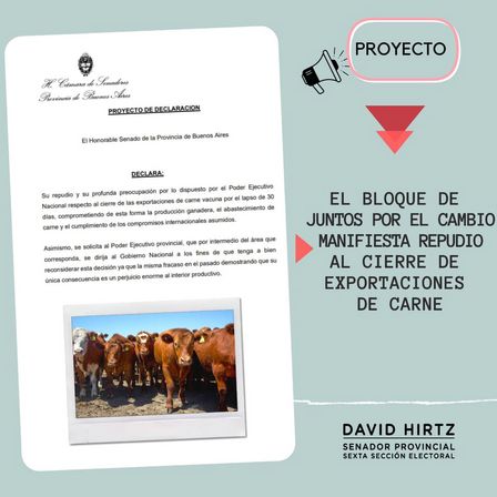 El mensaje expresa "en el día de hoy, los senadores Felicitas Beccar Varela y Alejandro Cellillo, acompañados por el senador David Hirtz y gran parte del bloque de Juntos por el Cambio del Senado Provincial, presentaron un proyecto de declaración manifestando su repudio y profunda preocupación por lo dispuesto por el Poder Ejecutivo Nacional respecto al cierre de las exportaciones de carne vacuna por el lapso de 30 días, en el entendimiento que la medida compromete gravemente la producción ganadera, el abastecimiento de carne y el cumplimiento de los compromisos internacionales asumidos.