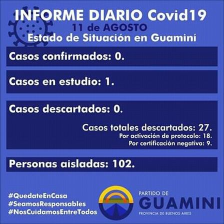 El nuevo informe del Comité de Crisis del Distrito de Guaminí señala que no hay casos ni confirmados ni sospechosos de Coronavirus en ese territorio.