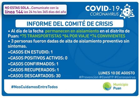 En el Partido de Guaminí no hay casos confirmados de Coronavirus según el reporte del Comité de Crisis.
