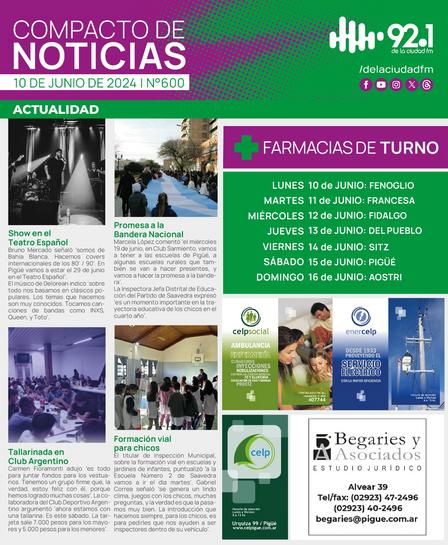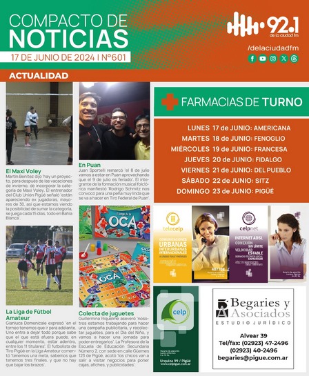 Hasta las 8.00 horas del día lunes 17 de junio de 2024, está de servicio el espacio ubicado en Mitre esquina Urquiza de Pigüé.