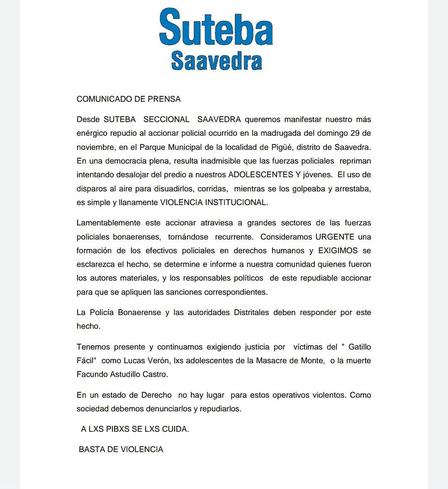 A través de un comunicado el gremio de los educadores del Distrito de Saavedra se dice textualmente "queremos manifestar nuestro más enérgico repudio al accionar policial ocurrido en la madrugada del domingo 29 de noviembre, en el Parque Municipal de la localidad de Pigüé, Distrito de Saavedra".