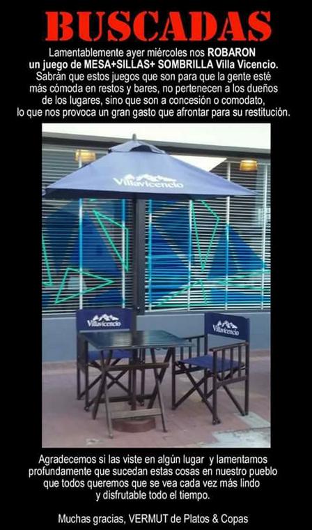 Las sillas, una mesa, y una sombrilla de madera oscura, y tela azul, con letras blancas, fueron robadas del centro de la ciudad.