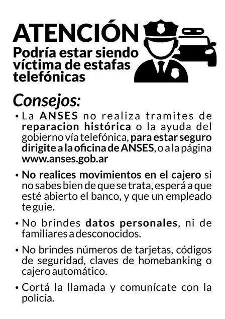 Teniendo en cuenta lo mencionado anteriormente se recomienda, que ante la recepción de llamados telefónicos con prefijo (011- 0221- 0223 - 0351), donde el llamante pide el cambio urgente de dinero como así también el registro de joyas, haga caso omiso a tal solicitud y de aviso de inmediato a los teléfonos de emergencias que posee la dependencia local (EMERGENCIAS 101-103).