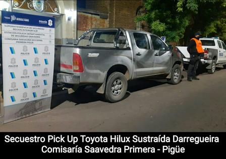 El parte de prensa indica que "personal policial de esta Seccional Policial, con fecha 07 de Febrero del corriente año, 21:00 horas., procedieron al hallazgo y secuestro de una Pick-Up marca Toyota, modelo Hilux, con dominio colocado FRG-763 de color gris, en sector de vías férreas Expreso Pampeano, entre los Horneros y los Ñandúes de esta localidad, la cual había sido denunciada como sustraída en la ciudad de Darregueira en ese mismo día al señor Juan Cruz Viglianchino de 35 años.